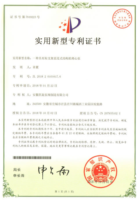專(zhuān)利證書(shū):一種具有短支架直連式結(jié)構(gòu)的離心泵