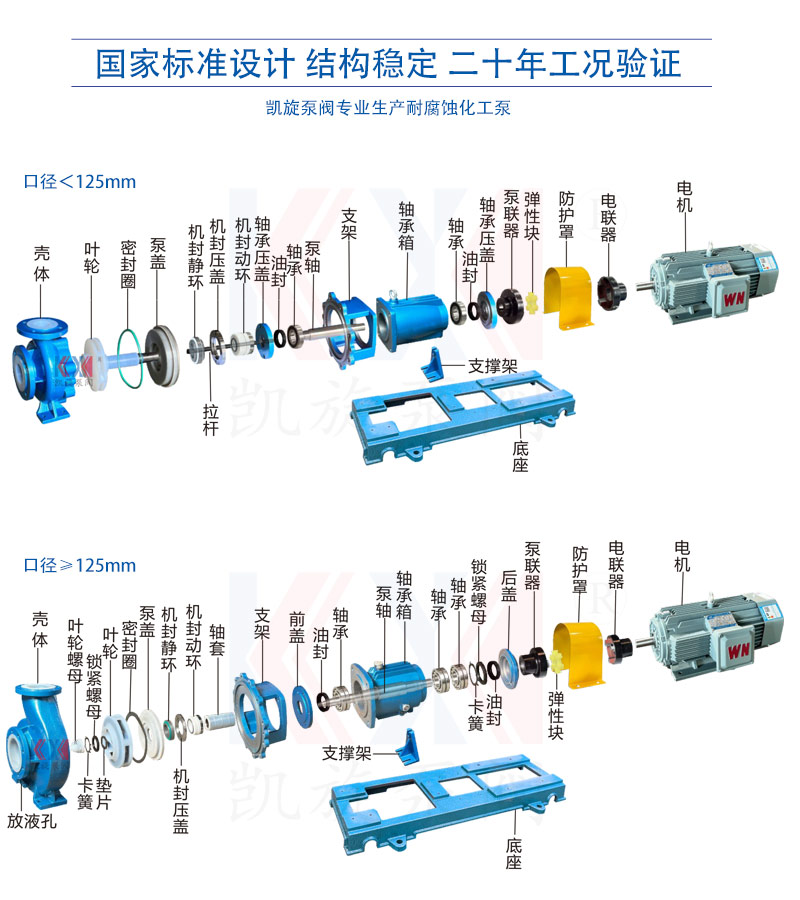 IHF型氟塑料離心泵,為單級單吸懸臂式離心泵。過流部件使用氟塑料、氟合金等材料制造。氟合金為聚四氟乙烯和聚全氟乙丙烯粉料按照配比充分混合,通過高溫燒結讓粉料熔合后,再模壓成型。氟合金材料同時具有聚全氟乙丙烯的韌性和聚四氟乙烯的耐溫性。IHF系列離心泵耐腐蝕效果優秀、通用性強,適用于較復雜的工況。